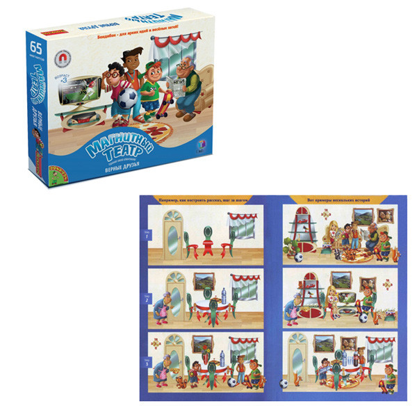 Игру «Магнитный театр» можно смело отнести к серии "долгоиграющих" игрушек, которыми ребёнок будет заигрываться многие годы. Это и развивающая и развлекающая игра, побуждающая детей думать, мыслить и фантазировать. С такой игрой можно легко обыгрывать сложные воспитательные моменты, в доступной игровой форме объяснять и наглядно показывать выход из сложных житейских ситуаций. Материал -- сверх сильные магнитные элементы. В комплекте - большая магнитная доска и набор (65-90 шт) ярких красочных магнитных элементов с изображением людей, предметов быта, интерьера. Все части игры легко накладываются друг на друга и крепко держатся даже в нескольких слоях. Это просто чудо - магниты, с которыми никогда не бывает скучно! Подходит детям в возрасте 3-10 лет. Магнитами можно играть не только на входящей в комплект доске, но и на любой другой магнитной доске или холодильнике. Дайте простор воображению ребёнка, пусть размещает магнитные фигурки, бесконечно комбинируя создаваемые истории. Магнитные игры развивают: Мелкую моторику Память Логику Воображение Пространственную ориентацию Внимание к деталям Приучают к порядку И всё это - в процессе весёлой игры!