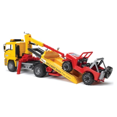 Модель 1:16. Эвакуатор является одним из самых популярных и многофункциональных автомобилей на городских улицах. Зеркала складываются, водительская кабина откидывается (открывается доступ к двигателю), портативным кран позволяет загрузить на платформу автомобили. Платформа опускается. Оснащён двумя опорами. Эвакуирует автомобили на платформе и на буксире за передние колёса автомобиля. Колёса эвакуаторы прорезинены. Капот внедорожника открывается, ветровое стекло опускается, Передние колёса поворачиваются рулём. Бывает трёх цветов – красный, зеленый, жёлтый. В наборе эвакуатор, внедорожник и набор аксессуаров для эвакуации автомобилей (цепи с фиксаторами для колёс)