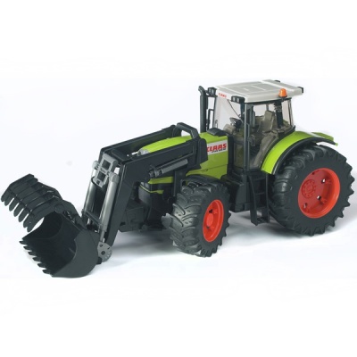 Модель 1:16. Колёса поворачиваются дополнительным рулём. Капот поднимается (открывается доступ к двигателю). Двери кабины открываются. Передняя ось оснащена амортизатором. Фаркоп. Ковш поднимается вверх/вниз, меняет угол наклона. Колёса прорезинены. В наборе трактор с погрузчиком