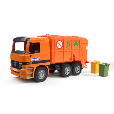 Модель 1:16. Мусоровоз с задней загрузкой мусорных корзин Водительская кабина откидывается (открывается доступ к двигателю), зеркала складываются, подъемник мусорных корзин забрасывает мусор из корзин в заднюю часть мусорного контейнера, мусорный контейнер можно опрокинуть для сброса мусора, на крыше находится дополнительный люк. Колёса прорезинены. В наборе мусоровоз и 2 мусорные корзины