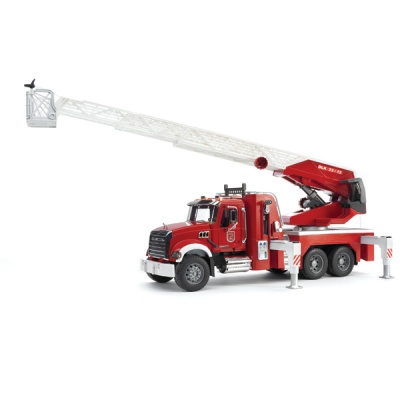 Модель 1:16. Пожарная машина с выдвижной трёхуровневой лестницей является долгожданной новинкой. Длина стрелы 1,2метра. Лестница меняет угол наклона и выдвигается специальной ручкой. К лестнице прикреплена люлька, которая меняет угол наклона. Машина оснащена пожарным рукавом с ёмкостью для воды и функционирующим помповым насосом. Платформа машины поворачивается на 360°, Двери водительской кабины открываются, зеркала складываются, есть ящик для инструментов, оснащёна четырьмя опорами для устойчивости. Капот поднимается (открывается доступ к двигателю). Машина выделяется хромированными элементами – радиатором, баком, козырьком, поручнями, зеркалами, выхлопной трубой. Колёса прорезинены. Специальный модуль с мигающими лампочками и звуком продолжительностью 18 секунд (4 режима - гудок, звук двигателя, мигающие лампочки, сирена с 2 вариантами – американская, европейская). В наборе пожарная машина, модуль со световыми и звуковыми эффектами и батарейки