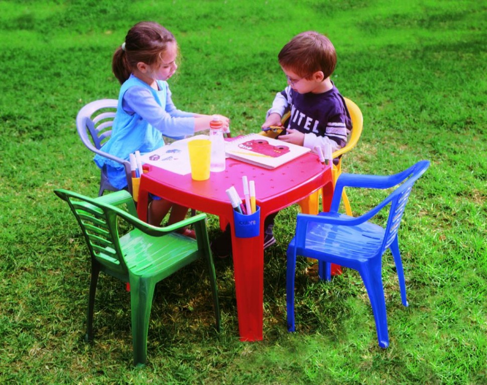 Стол — детский пластиковый с карманами, для улицы Marian PlastЯркий и удобный детский столик с карманами для карандашей и фломастеров.