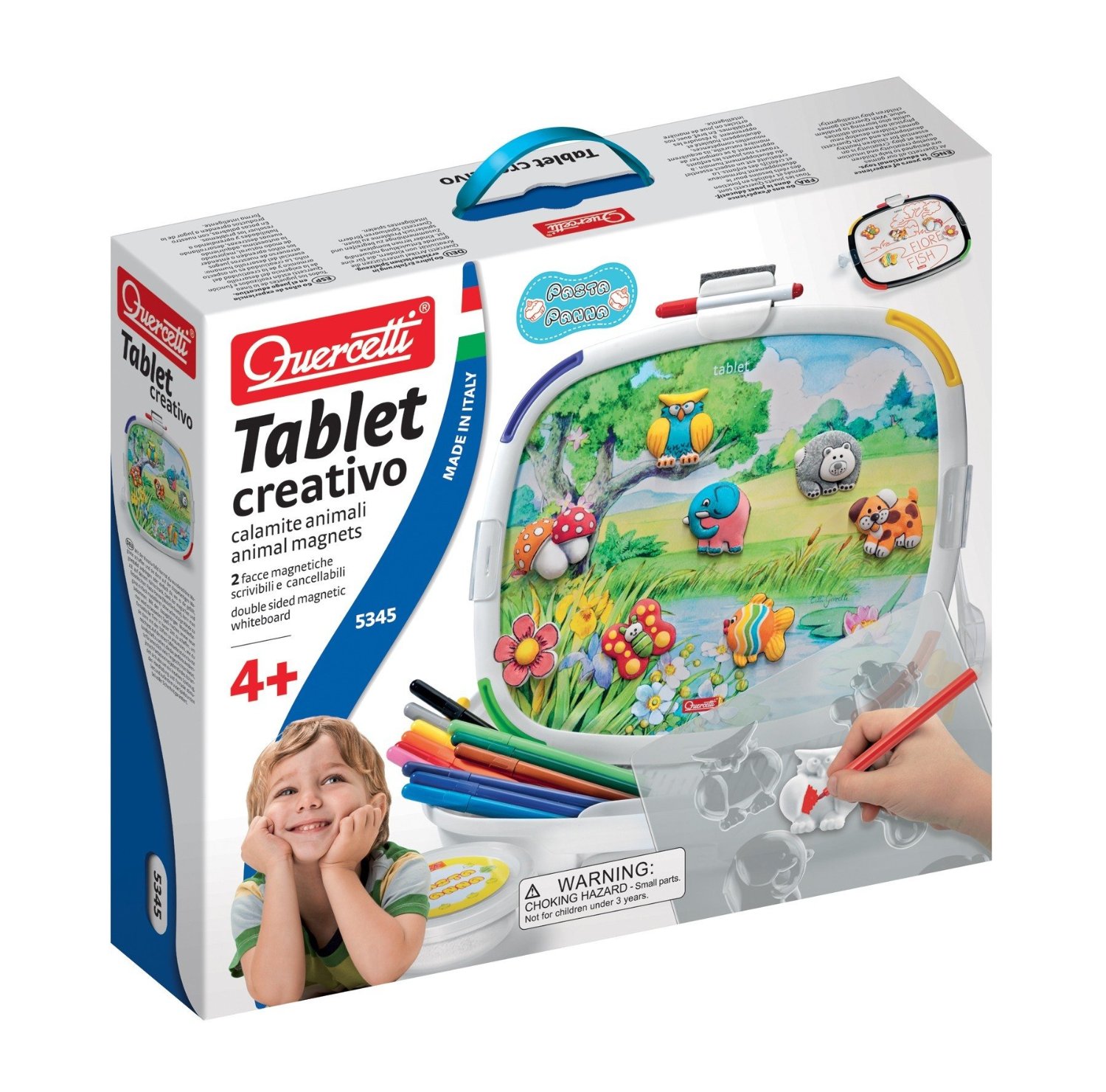 Приятные особенности магнитной доски с элементами для моделирования Quercetti, 5345: с магнитной доской вы можете создать веселые магниты, приложить к двухсторонней доске, или где вы хотите, например, на холодильник на кухне. Благодаря волшебной Пасте, которая легко формируется и легкая, как перышко, не прилипает к рукам, и пресс-формам, ребенок может сделать фантастических животных в очень короткое время, а затем раскрасить их в любые цвета с помощью специальных маркеров. Доска двухсторонняя. Одна сторона доски имеет красочный вид, на котором вы можете разыгрывать бесконечные рассказы с животными. Другая белая, где ребенок сам сможет нарисовать свою картину для своего сценария игры. Это игра, которая имеет высокую образовательную ценность, которая развивается художественные навыки, координацию движений и призывает детей творчески мыслить.