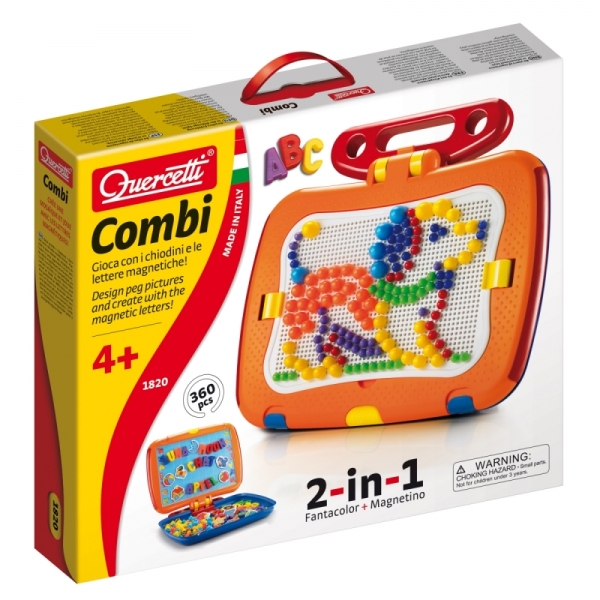 Уникальный набор COMBI от Quercetti состоящий из классической мозаики и магнитной мозаики в одном многофункциональном кейсе. Одна сторона доски предназначена для создания красочных изображений и узоров при помощи ярких разноцветных колышек, а на второй стороне доски дети могут практиковаться в написании своих первых слов с помощью магнитных букв или сухостираемого маркера. Набор Мозаики COMBI от Quercetti не имеет острых углов и может быть безопасно использован как развивающая игрушка для детей. Игра с мозаикой отлично развивает творческие способности ребенка, цветовосприятие, тренирует координацию движений и мелкую моторику рук. У нас можно купить мозаику COMBI в многофункциональном кейсе с ручкой для удобного хранения элементов после использования.