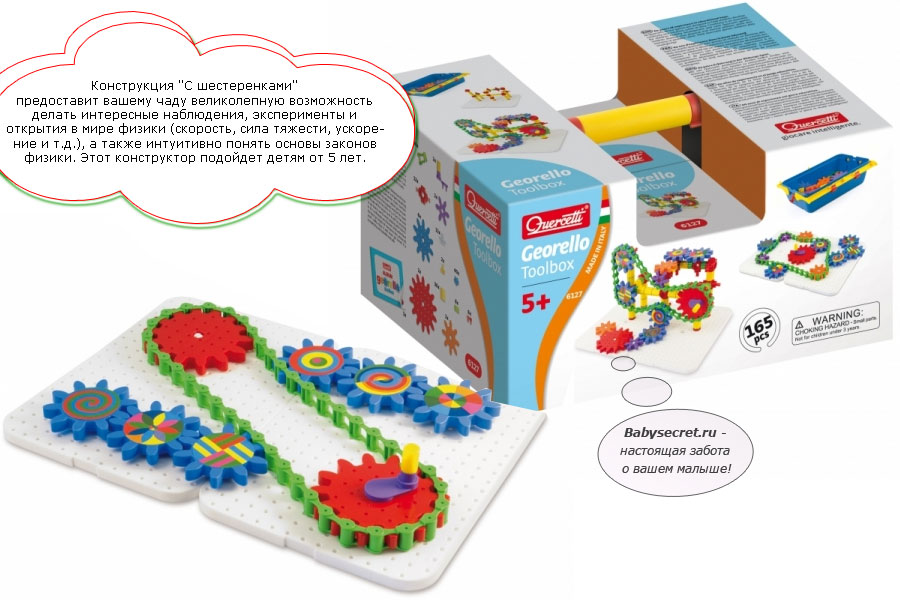 Конструкция "С шестеренками" предоставит вашему чаду великолепную возможность делать интересные наблюдения, эксперименты и открытия в мире физики (скорость, сила тяжести, ускорение и т.д.), а также интуитивно понять основы законов физики. Этот конструктор подойдет детям от 4 лет.