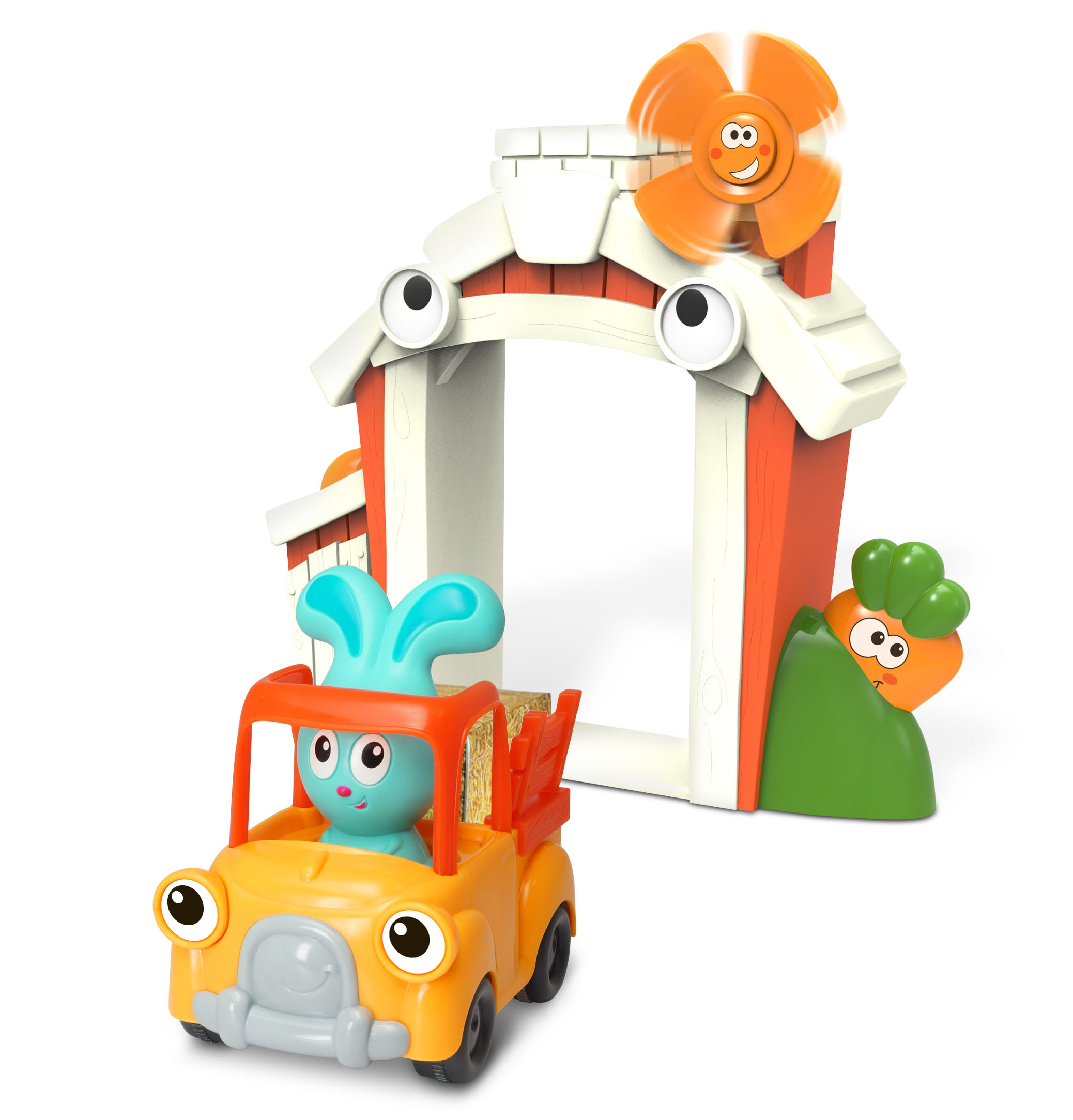 Представляя себя фермером, ребенок с увлечением будет грузить в машинку сено, искать курочку, доставать морковку, возить зайчика Бани на автомобиле по территории фермы.