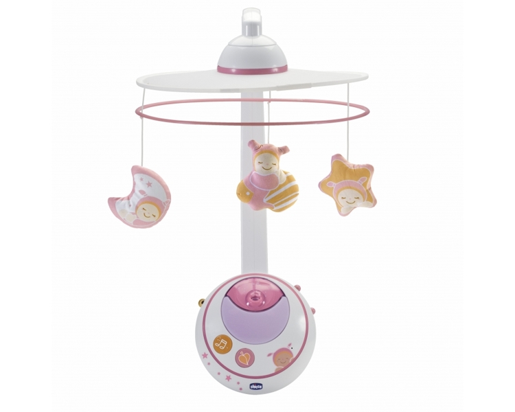 Подвеска для кровати Chicco Первые Мечты розовая с ДУ 00002429100000 с тремя мягкими подвесными игрушками (луна, звездочка, спящая девочка), проектором, блоком управления и пультом ДУ.