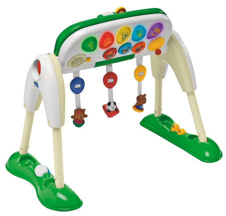 Игровой стол имеет два варианта установки: пианино с мелодиями и звуками; игровой центр с маленькой книжкой, роликом, вращающимся диском, 3 обучающие формы, 5 клавиш: мелодии в исполнении различных инструментов, комбинированы со световыми эффектами. Гимнастические комплексы и другие виды игрушек развивают тактильные ощущения, мелкую моторику и стимулируют развитие координации.