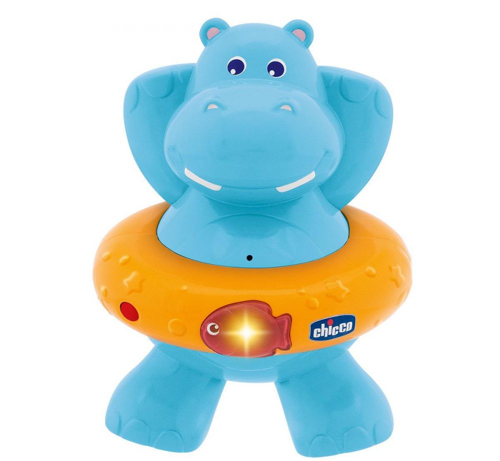 Игрушка для ванны Chicco "Счастливый бегемотик" голубого цвета с желтым "надувным" кругом составит компанию малышу во время купания.