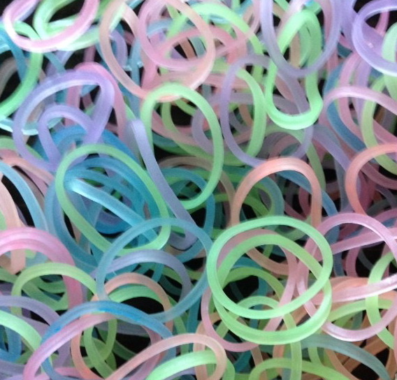 Резиночки из набора небольшого размера, эластичные, их удобно брать в руки и растягивать, создавая различные узоры. Готовое изделие крепится при помощи с-образной прозрачной клипсы. Днем изделие будет иметь светло-фиолетовый оттенок, в ночное время будет излучать неоновый свет.