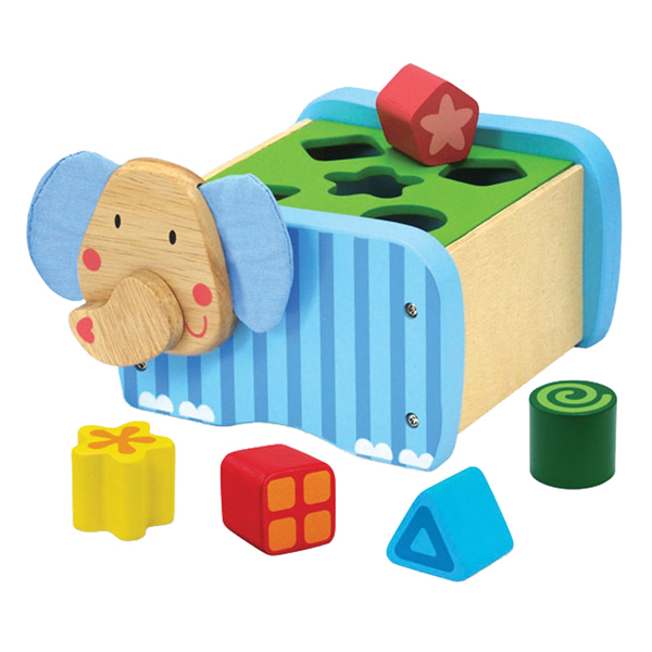 Замечательная развивающая игрушка из натуральных материалов - деревянный сортер-слоник с милыми тканевыми ушками, разноцветные деревянные кубики-фигурки.