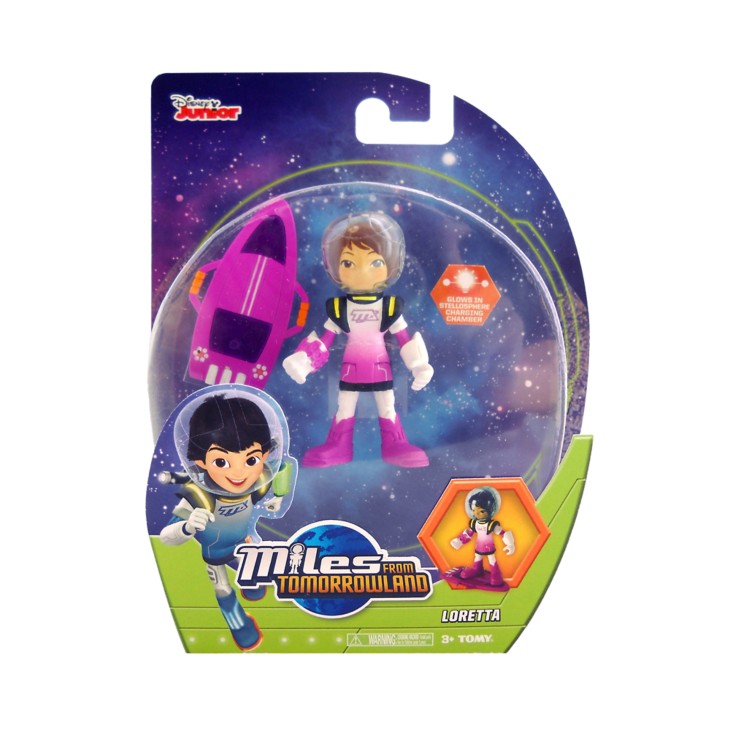 Фигурка изображает героиню мультфильма "Майлз с другой планеты" - Лоретту, старшую сестру главного героя картины. По сюжету сериала девочка вместе со своей семьей отправилась на космическом корабле путешествовать по вселенной и исследовать невиданные миры, во время полетов она выполняла роль технического специалиста. Одета Лоретта в симпатичный розовый скафандр, на голове - яркий шлем. У игрушки подвижные голова, руки и ноги, благодаря этой особенности ребенок сможет создавать динамичные сценки во время космических путешествий. Благодаря яркому бластборду героиня сможет перемещаться над поверхностью!
