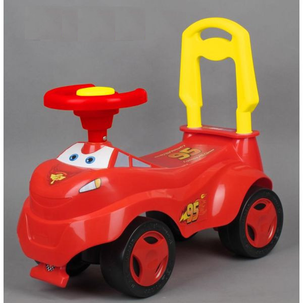 Сбылась мечта многих мальчиков -- теперь они могут прокатиться на герое любимого мультфильма <<Тачки>> Молнии Маккуине. Правда, это будет отнюдь не гоночная скорость, но все же. Каталка для малышей в виде этого оптимистичного гонщика подходит для тех, кто еще не начал осваивать велосипед. Ребенок может сам ее катить, отталкиваясь ногами от земли. Колеса очень широкие и устойчивые. А может положиться на родителей, для который устроена желтая ручка позади. А малыш тем временем сможет нажать на музыкальный руль и послушать, что играет в приемнике Маккуина. В каталку вставлен русский звуковой чип.