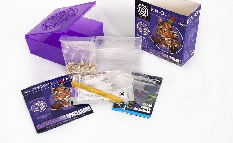 В наборе: порошок для выращивания, кристаллы, специальный контейнер для выращивания, мерный стаканчик, каменное основание для кристалла, перчатки, палочка для размешивания, инструкция на русском языке.