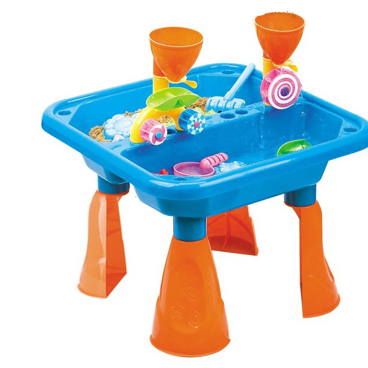 Удобная столешница с двумя углублениями-- это отличное поле для творчества для маленького инженера и игр на свежем воздухе.В комплекте предусмотрено: стол, лопатка, лейка, шесть формочек, две воронки, два водяных колеса, две лодки, совок, стакан, два вкладыша.