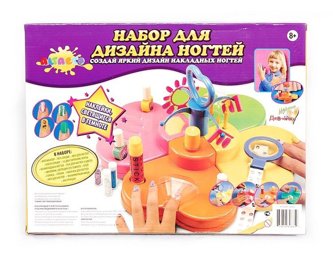 Получив на руки такой замечательный набор для проявления дизайнерских навыков и творческих идей, Ваша малышка сможет почувствовать себя профессиональным мастером маникюра. Для выполнения увлекательного творческого задания в комплекте предусмотрены: пластиковая подставка, 48 штук накладных ногтей, 3 лака для ногтей, переводки в количестве 100 штук, светящиеся в темноте наклейки, губка, 3 пилочки для ногтей, 3 пакетика блёсток, клей, подробная инструкция. Используя входящие в комплект игровые аксессуары и приборы можно легко и быстро создать прекрасный дизайн ногтей за считанные минуты. Творческий процесс надолго увлечет детское внимание, развивая зрительно-тактильное восприятие, мелкую моторику и проявление фантазий, воображения. Все составляющие набора выполнены из высококачественного и прочного материала, и упакованы в красочную коробку из картона.