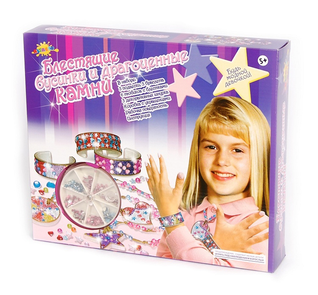 С этим набором для творчества Ваша юная рукодельница создаст дивной красоты украшения из "драгоценных" камней, грани которых переливаются радужными цветами, завораживают взгляды и привлекают внимание. Для выполнения увлекательного творческого задания в комплекте предусмотрены: пластиковая коробка, 3 подвески, 3 браслета, 6 тюбиков с блеском, 3 декоративных шнурка, коробочка с пластмассовыми украшениями, салфетка, бумажные подложки для браслетов и подвесок, подробная инструкция. Нетерпеливые детские пальчики будут старательно нанизывать блестящие бусинки на шнурки-ниточки при создании подвесок, а также украшать готовые браслетики сияющими стразами в форме сердечек. Творческое увлечение-хобби настроит деток на положительный эмоциональный фон, развивая зрительно-тактильное восприятие, мелкую моторику. Все составляющие набора выполнены из высококачественного и прочного материала, и упакованы в красочную коробку из картона.