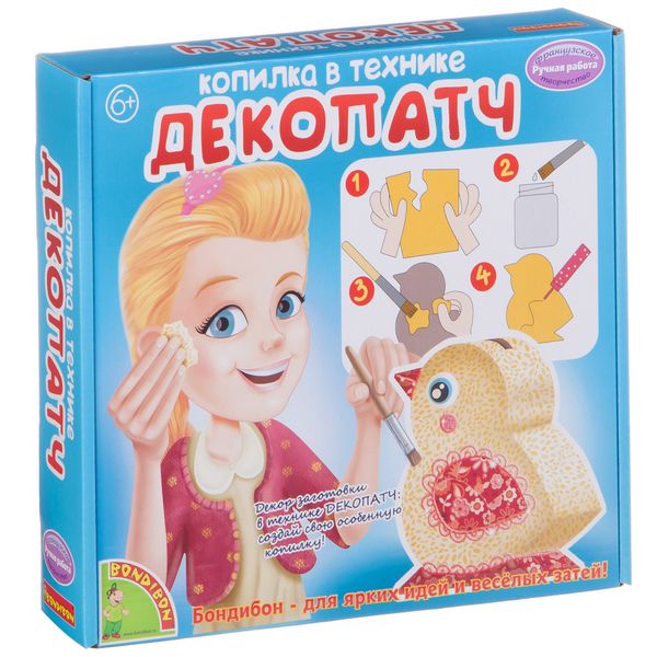 BONDIBON. Набор, обучающий уникальной технике "росписи" бумагой -технике ДЕКОПАТЧ. С помощью подробной инструкции Ваш ребенок самостоятельно освоит новый вид творчества и сделает из простой заготовки свою особенную, авторскую копилку. Все необходимые материалы для работы - в комплекте!
