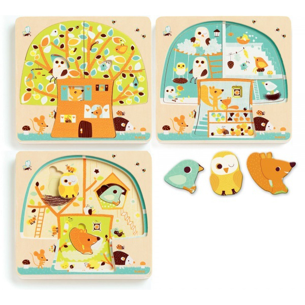 На фоновую рамку-основу малышам предстоит вставлять пазлы в три слоя, каждый из которых представляет собой дом для забавных семейств белочек, совы и птиц. Первый верхний слой - дом-дерево, второй - комнаты, а нижний третий слой - жители комнат.