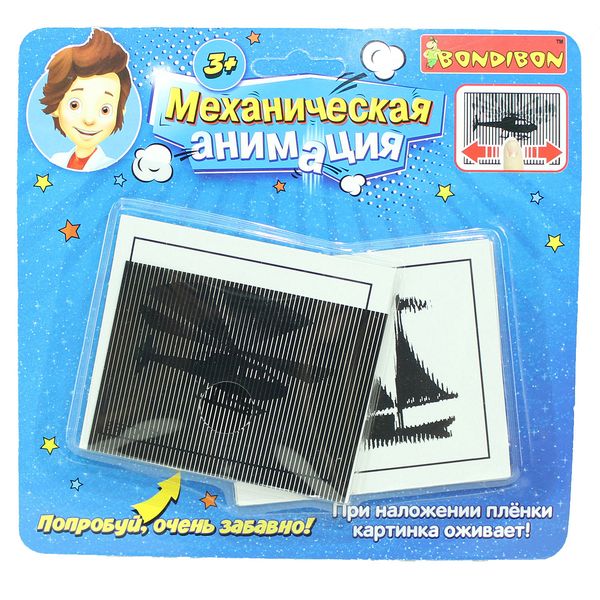 Положите плёнку на карточку с картинкой. Затем слегка подвигайте плёнку влево и вправо. Картинка "оживёт". В комплекте набора 'Механическая анимация' 16 разнообразных карточек. На упаковке находится отверстие, с помощью которого вы сможете протестировать игру, не открывая упаковки.
