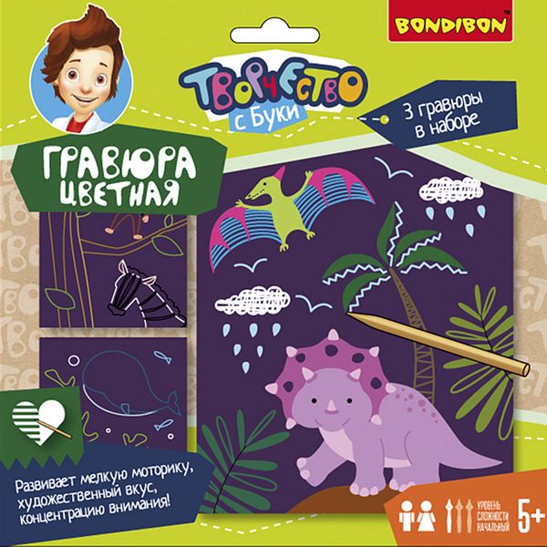 BONDIBON. Этот тип гравюры разработан специально для самых маленьких: крупные детали, четкие линии, интересные сюжеты, легкость процарапывания скребком. В итоге получается веселая разноцветная картинка. Во время выполнения у ребенка развивается мелкая моторика, воображение, концентрация внимания. В наборе: - 3 картины с изображением - скребок Рекомендованный возраст: от 4 лет.