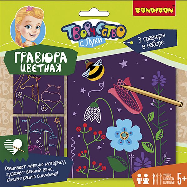 BONDIBON. Этот тип гравюры разработан специально для самых маленьких: крупные детали, четкие линии, интересные сюжеты, легкость процарапывания скребком. В итоге получается веселая разноцветная картинка. Во время выполнения у ребенка развивается мелкая моторика, воображение, концентрация внимания. В наборе: - 3 картины с изображением - скребок Рекомендованный возраст: от 4 лет.