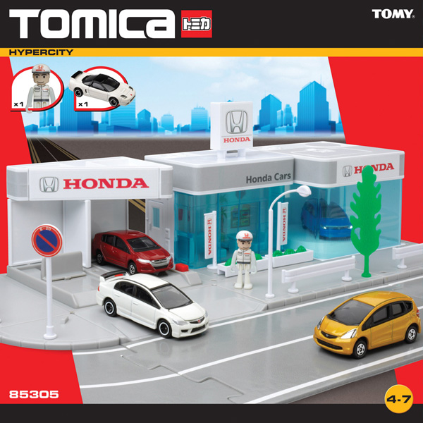 В наборе: машина Honda, магазин Honda с вращающимся подиумом и открывающимися дверями,