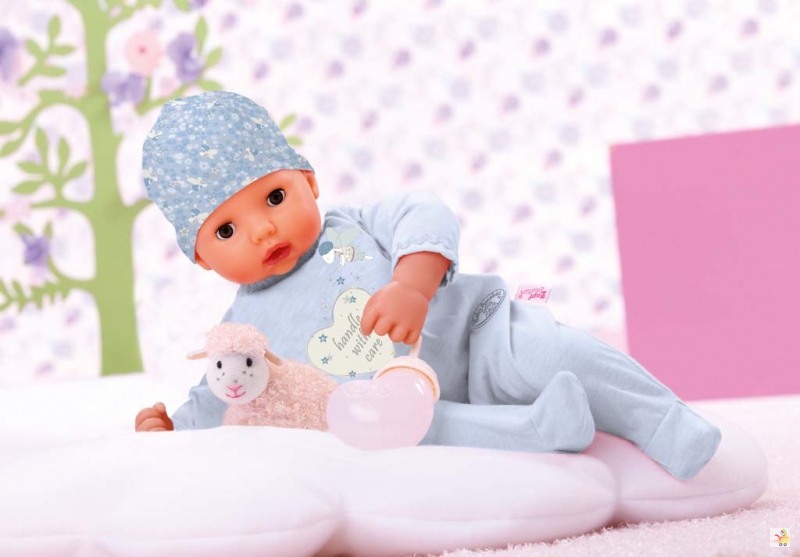 Тело куклы мягконабивное, голова руки и ноги – из приятного на ощупь винила. Одет малыш Анабель в голубой комбинезон и шапочку.