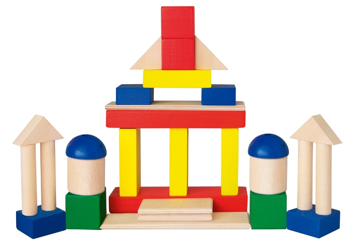 ДЕТЕЙ МЛАДШЕГО ВОЗРАСТА: знакомит с деталями (кубик, кирпичик, призма, пластина, цилиндр). Учит сооружать элементарные постройки не только по образцу, но и самостоятельно, используя дополнительные сюжетные игрушки, соразмерные масштабам построек.