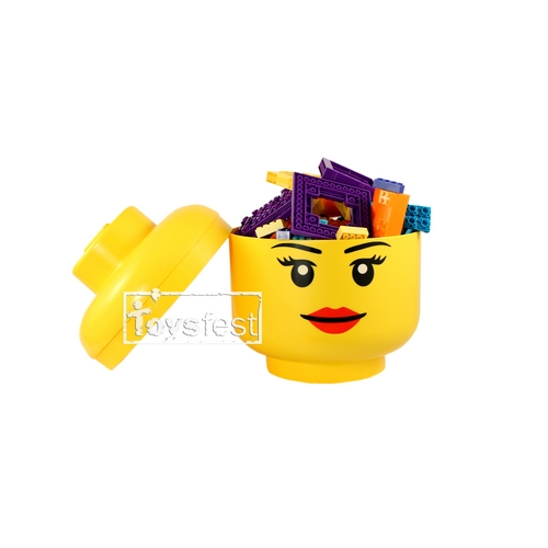 Контейнер представляет собой знаменитую "Голову" Lego, которую приспособили для хранения конструктора Lego. Контейнер выполнен в форме головы "Девочки Lego", Верхняя часть снимается, а внутри можно хранить все что угодно.